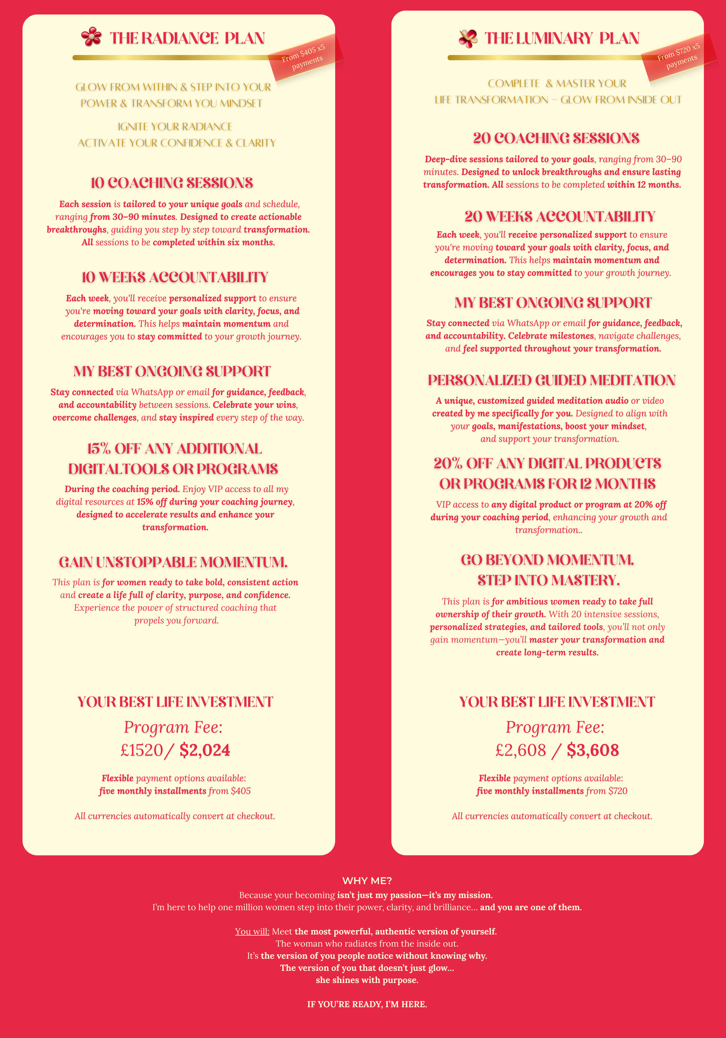 add the : Book a 20 minute radiance call to start (then during call i send them the payment and they pay) here link the calendly event for packages only like: "book your radiance call to start your package" /// Optional note under the button: “Payment is completed after the call to ensure alignment and the perfect fit.”///