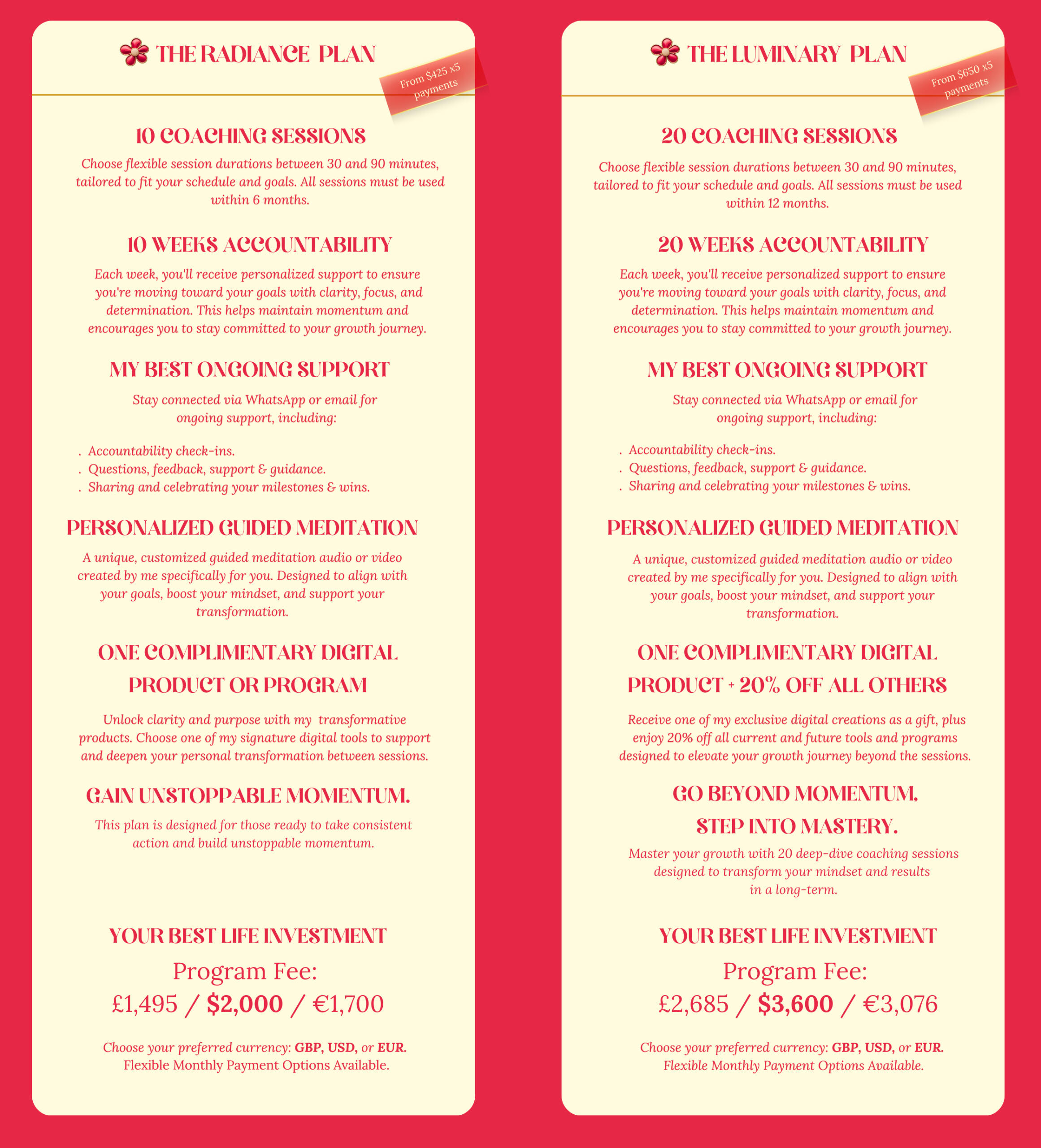 Starting at £220 / €250 / $240, this deep-dive 90-minute session is designed for rapid breakthroughs and transformative insights. Whether you need clarity, a mindset shift, or a reset, this session is tailored to your unique journey. Pricing may vary based on depth and scope.. Life-Changing Packages