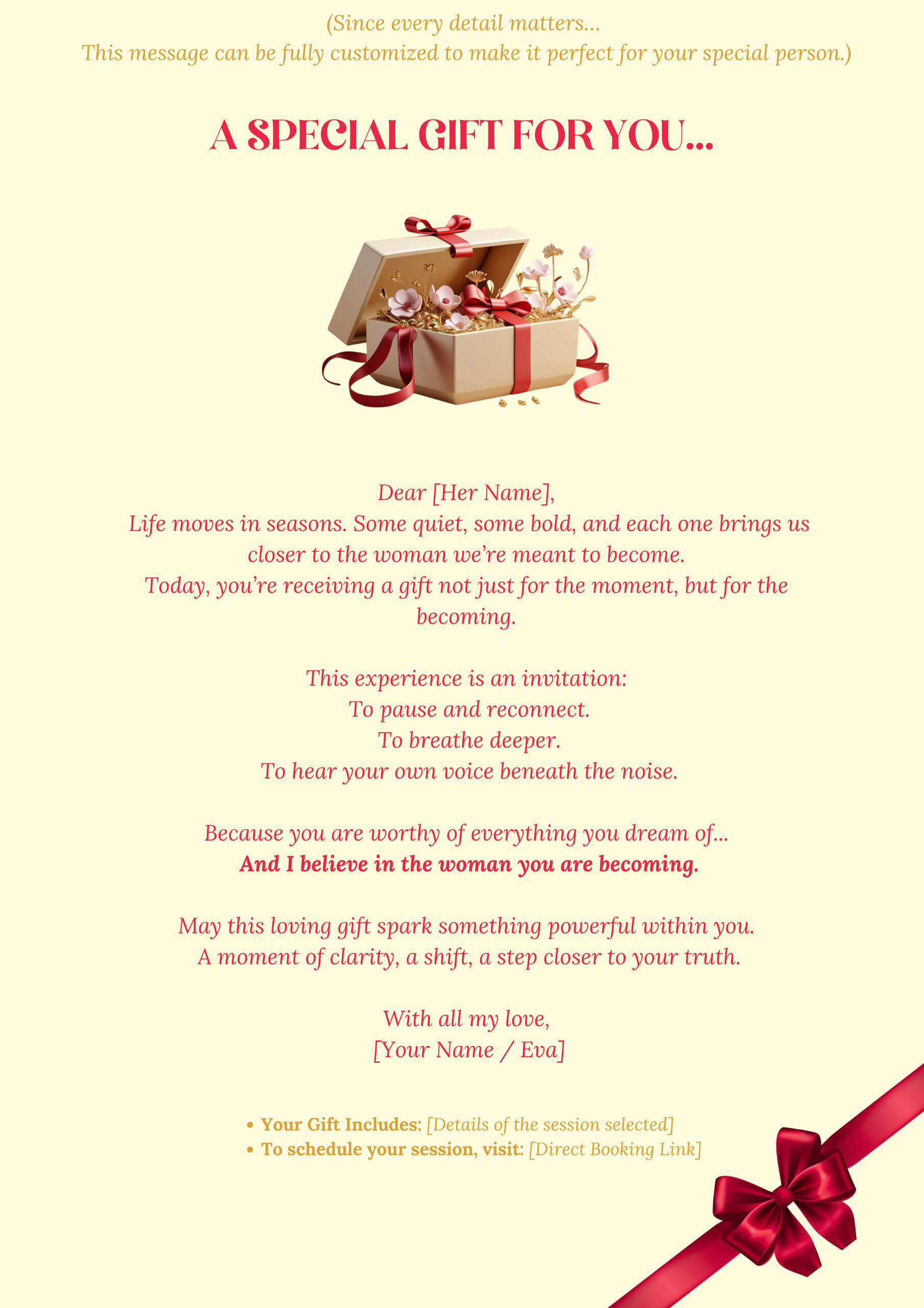 LOOKING FOR A MEANINGFUL GIFT THAT LEAVES A LASTING IMPACT?Surprise a friend, loved one, or colleague with a powerful coaching session or a full transformation journey. A gift that can spark clarity, confidence, and true inner growth.Whether it’s for a birthday, a celebration, or simply “just because” this is more than a present. It’s an invitation to step into their next, best chapter!